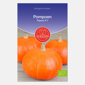 Pompoen 'Tractor F1' geeft gemakkelijk te snijden en te ontpitten vruchten met veel vruchtvlees. Het is een zeer productief ras en vormt grote, bolvormig afgeplatte vruchten met een oranje kleur. Eén zakje is voor circa 5m2, en de plantafstand bedraagt 75x75 cm.