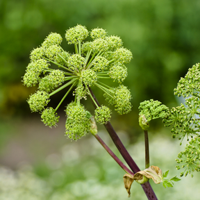Engelwortel is een indrukwekkende, aromatische plant met grote, frisgroene bladeren en statige bloemschermen. Deze tweejarige (soms kortlevend meerjarige) plant staat bekend om haar krachtige geur en veelzijdig gebruik: stengels, bladeren, zaden en wortels worden traditioneel gebruikt in de keuken en kruidengeneeskunde. De smaak is kruidig, licht zoet en doet denken aan selder en anijs.