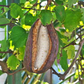 Na de bloei kunnen in warme zomers opvallende, paarsgrijze vruchten ontstaan die barsten als ze rijp zijn. Het binnenste vruchtvlees is zoet en gelei-achtig en kan vers gegeten worden. De smaak doet denken aan subtiele kokos- of meloenaroma’s. De schil is traditioneel eetbaar na bereiding (bijv. roerbakken), maar wordt in Europa vooral decoratief gewaardeerd.