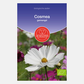 De forse plant Cosmea, gemengd, is gevoelig voor vorst. Geeft grote bloemen, die wit, licht- en donkerroze gekleurd zijn. Deze plant is geschikt als snijbloem en blijft doorbloeien door hem te plukken. Eén zakje is voor circa 15m2, en de plantafstand bedraagt 40x40 cm.
