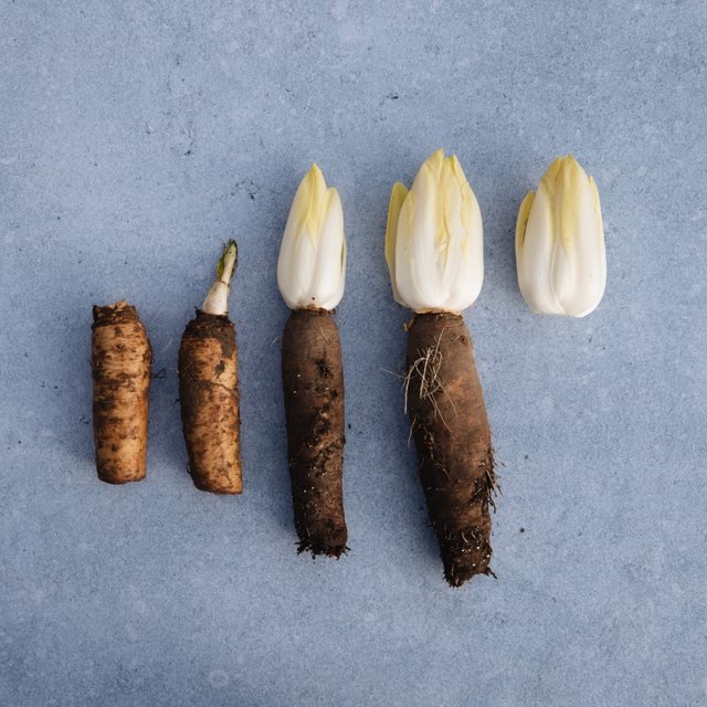 Voor je de wortels plant knip je het loof bij tot ongeveer twee tot drie centimeter en verwijder je de afgestorven blaadjes. Op de foto’s zie je witlofwortels die al netjes zijn bijgesneden.