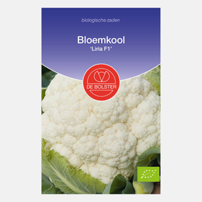 Cauliflower 'Liria F1' is self-covering, which means the cauliflower remains beautifully white. This strong variety is suitable for early autumn cultivation. It is a hybrid variety with a shorter growing period than the open-pollinated varieties. One bag is for approximately 14m2, and the planting distance is 75x55 cm.