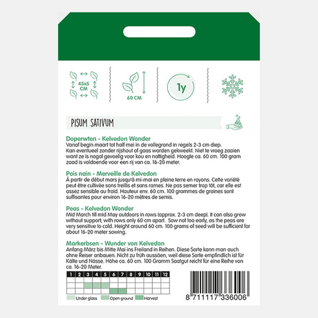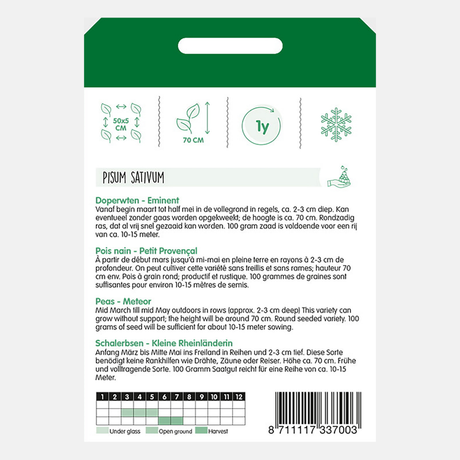 View all There are two types of pea seeds offered. We offer low and high varieties. The advantage of a low pea variety is that the plants do not need climbing support.