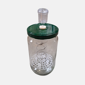 Fermentation pot for fermenting vegetables. This set contains: a 1.7 liter pot, a plastic pressure plate, a spring for pressing, an airlock and a thermometer strip.