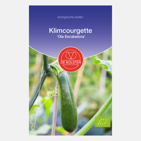 Climbing courgette 'Ola Escaladora' produces dark green fruits all summer long that taste delicious. Suitable as a fence or along the walls of a city garden. The plant loves sun. One bag is for approximately 3m2, and the planting distance is 60x60 cm.