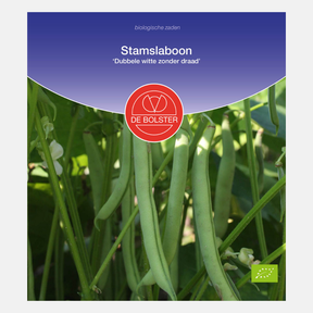 'Double white without thread' is a bean that is not very susceptible to mold in bad weather conditions. This pole bean is very tasty and tender. Sowing can start at the beginning of May. One bag is for approximately 14m2, and the planting distance is 45x10 cm.