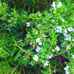 La sarriette vivace est une herbe aromatique basse et vivace, aux petites feuilles vert foncé et au goût piquant prononcé. Elle est indispensable pour assaisonner les haricots, les ragoûts, les plats de viande et les sauces épicées. Ses petites fleurs blanches à lilas pâle apparaissent en été, attirant les abeilles et autres insectes pollinisateurs.