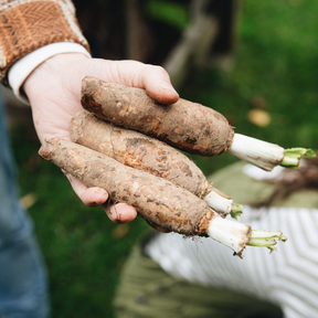 Voor je de wortels plant knip je het loof bij tot ongeveer twee tot drie centimeter en verwijder je de afgestorven blaadjes. Op de foto’s zie je witlofwortels die al netjes zijn bijgesneden.