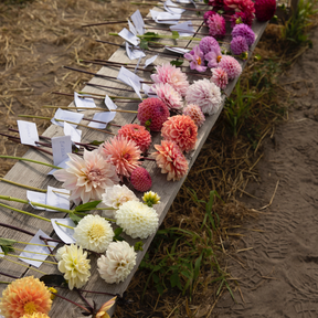 Ce paquet contient toutes les variétés de dahlias que nous avons — pas moins de 56. Merel et Nina ont passé des heures à créer une sélection qui représente chaque couleur et chaque forme, et c'est la collection ultime !