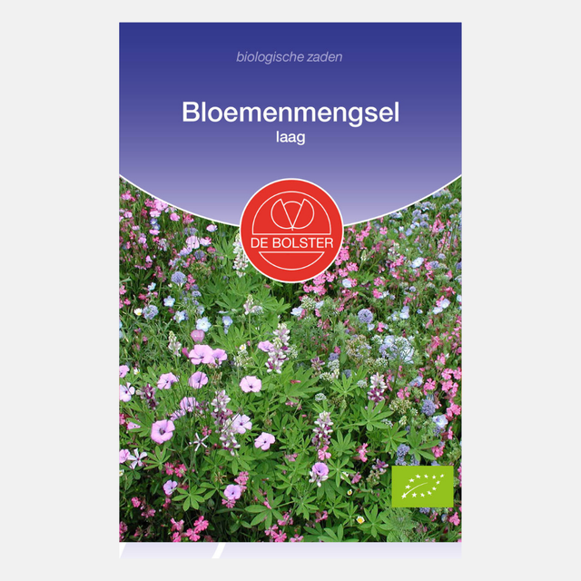 Bloemenmengsel, laag, bevat een gevarieerd eenjarig mengsel van o.a. koekruid, kleine lupine, bonte salie en klaproos. Deze planten bereiken ongeveer een hoogte van 30 cm. Eén zakje is voor circa 10m2, en de plantafstand bedraagt 30x1 cm.